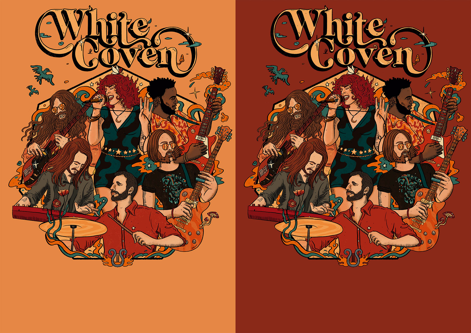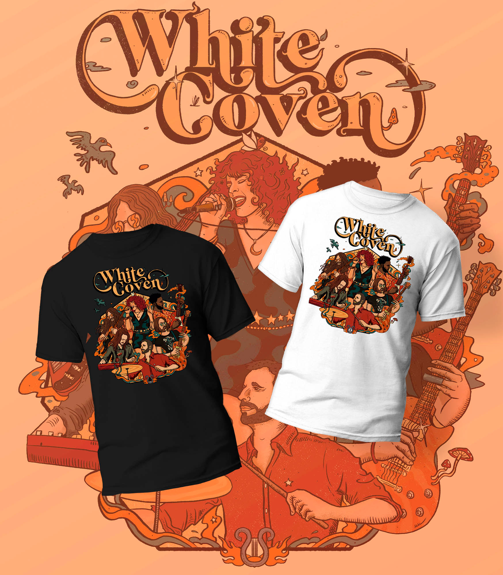 Work for the band White Coven. Cartel and t-shirt design.